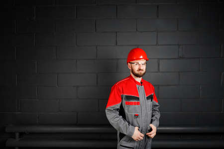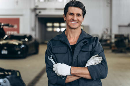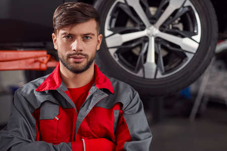 Confident handsome smiling mechanic in uniform. Car mechanic working at automotive service center.