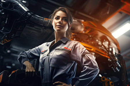 Beautiful auto mechanic Beautiful young woman holding work tool and looking at camera while leaning at the car tire in auto repair shop : Generative AI