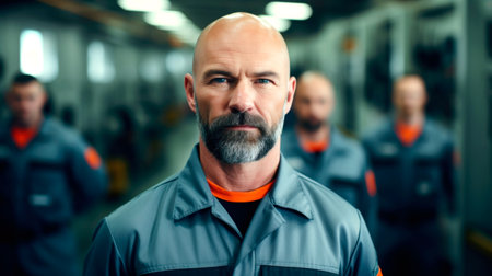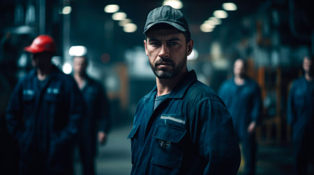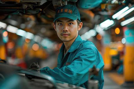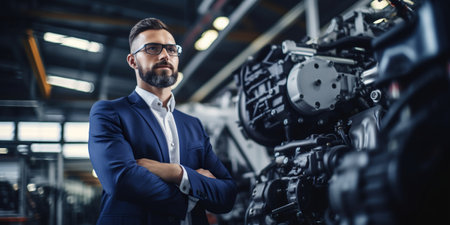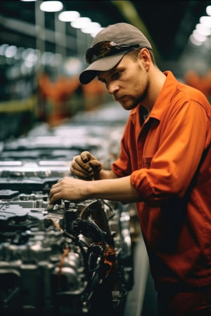 A confident worker demonstrates his expertise as he skillfully operates advanced machinery in a modern automotive manufacturing environment, ensuring efficient production. AI Generative AI