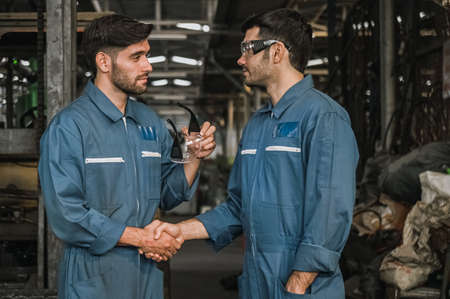 happy engineer men wearing uniform safety in factory shaking hand talking relax time working.