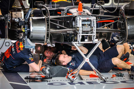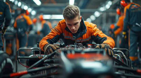 Young man in colorful uniform, mechanics adjusting race car components, fixing and preparing care for upcoming races.