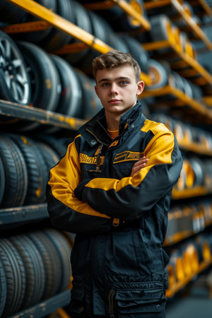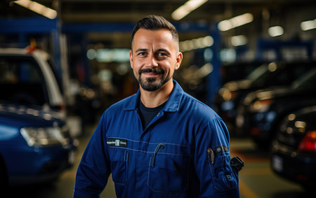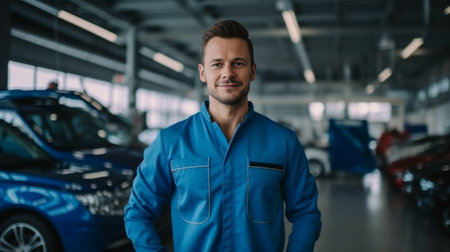 Handsome young man in a mechanic uniform stands proudly in a well lit automotive workshop.