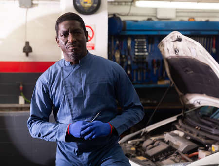 Auto service technician in uniform standing on the background of a car with a screwdriver and repair and maintenance of the car. Garage and car parts replacement concept