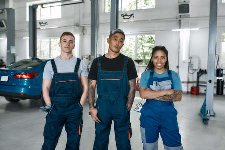 We repair your car. Team of proud diverse mechanics in uniform, two men and a woman smiling at camera, while standing at auto repair shop