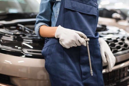 partial view of young african american mechanic holding wrench and standing near car in auto repair service