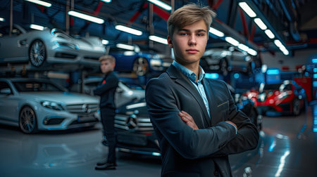 A young man in a suit stands with his arms crossed and looks at the camera, against the backdrop of an expensive car showroom.