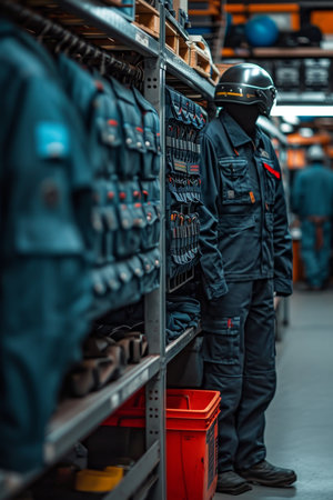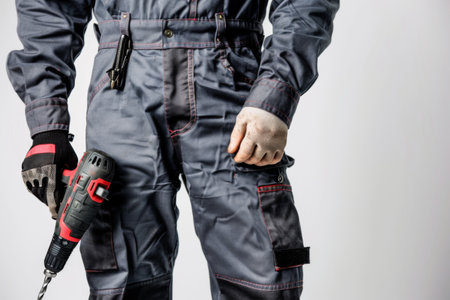 A worker dressed in durable, protective clothing grips a power drill, ready to tackle home improvement tasks. The workshop's bright lighting highlights the preparation for a busy project ahead.
