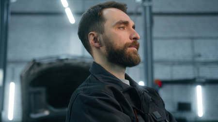 Close up male portrait Caucasian man professional industrial worker in uniform mechanic auto engineer technician specialist guy serious looking profile posing with crossed hands in car service factory