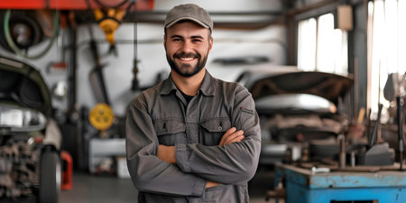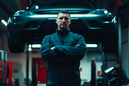 A composed, stylish male car mechanic stands confidently with folded arms in front of a lifted car, exuding trust and professionalism against a clean car shop backdrop