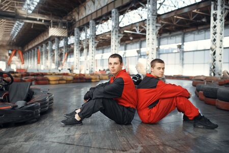 happy multicultural men chatting inside of kart circuit, kart racers holding helmets, banner