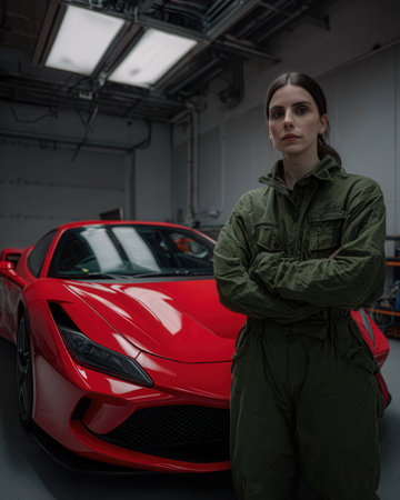 A young female with a warm smile stands confidently beside a shiny red sports car in a contemporary workshop. The atmosphere is bright and inviting.