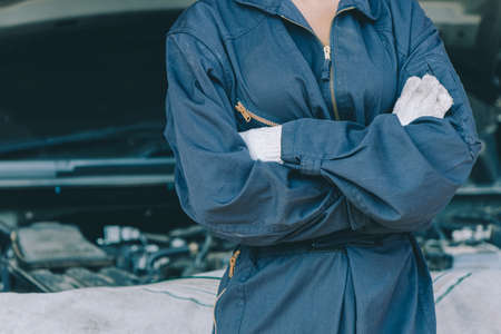 Portrait of professional mechanic in uniform crossing one's arms with hood at repair garage. Car insurance concept.
