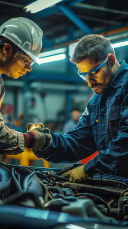 Two mechanics work closely together, focused on repairing an engine. The bright workshop buzzes with activity, showcasing teamwork and expertise in automotive repair.