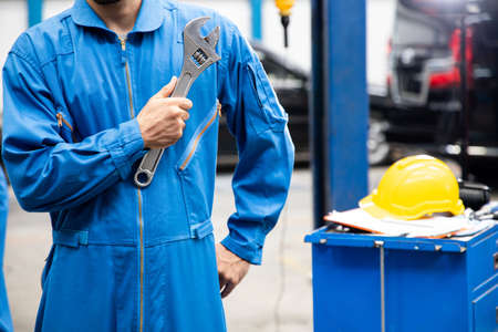 Car service, repair, maintenance and people concept. Waist up portrait view of the auto mechanic man or smith with wrench at workshop