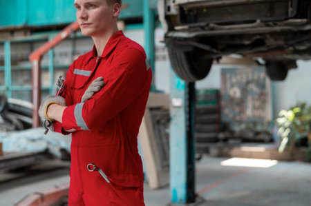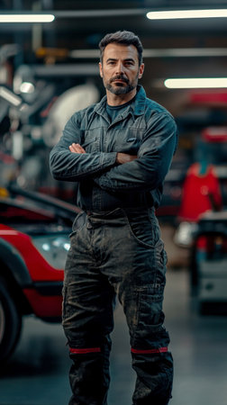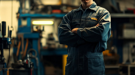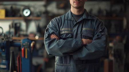 Mechanic in a garage, medium shot, arms crossed, wearing overalls with oil stains, tools and equipment blurred in the background. generative ai