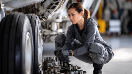 A woman is working on a plane engine. She is wearing a black jacket and grey pants. She is kneeling down and looking at the engine
