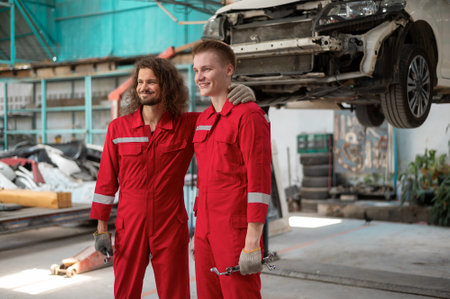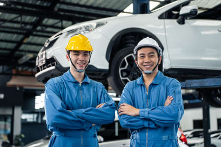 Portrait of Asian two handsome automotive mechanic men stand in garage. Vehicle service manager worker work in mechanics workshop, look at camera after check and maintenance to repair the engine car.