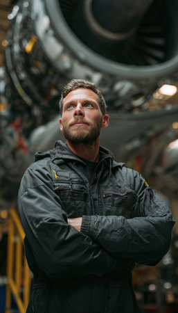 Confident Aerospace Technician in Hangar with Cinematic Light Reflections