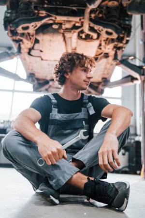 With tool in hand. Adult man in grey colored uniform works in the automobile salon