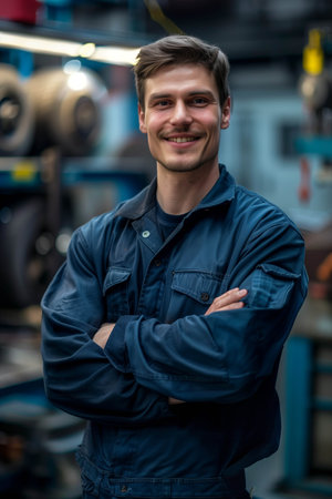 Confident Caucasian male auto mechanic in blue uniform stands with arms crossed in auto repair shop.