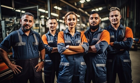 Successful mechanics working in a group perform repairs and upkeep in the garage.