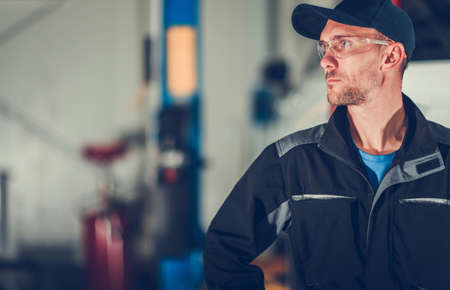 Caucasian Automotive Car Technician in His 40s. Car Mechanic Staying Inside Auto Service Center. Transportation Industry Theme.