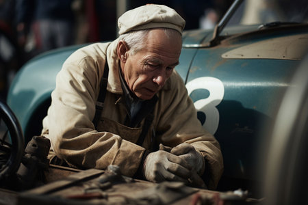 An AI generated illustration of An elderly man is standing in front of an antique race car, engaged in work