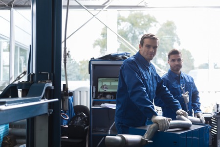 Caucasian repairmen are analyzing and fixing broken car in car repair mechanic shop