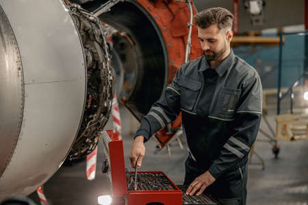 Specialist mechanic repairs the maintenance of a large engine of a passenger aircraft in a hangar