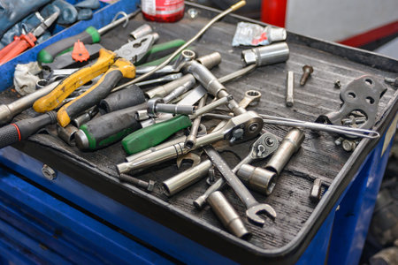 Locksmith's wrenches, screwdrivers and heads are in a repair box at a workshop. Tool in a car workshop.
