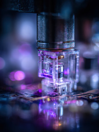 Detailed perspective on a transparent connector interacting with a circuit board, surrounded by vibrant lights that highlight the technology and craftsmanship.