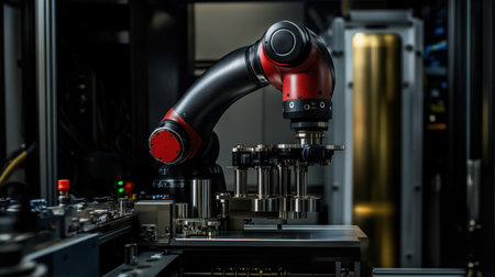 Close-up view of a robotic arm in an advanced industrial setting, showcasing its design and precision in handling complex tasks within a manufacturing environment.