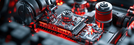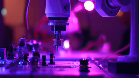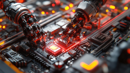 A robotic hands assembling electronic circuit board with glowing microchip, showcasing advanced technology and futuristic innovation in electronics