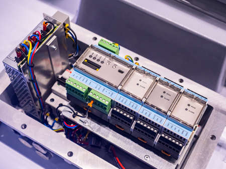 Electrical appliance inside view. Mechanism of complex electrical appliance. Concept - production and repair of electrical equipment. Sophisticated power equipment. Mechanism of some device