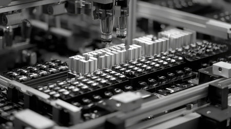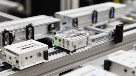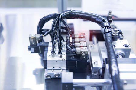 A detailed close-up shot showcasing intricate industrial machinery and equipment components in a factory setting. The image highlights precision and technology.