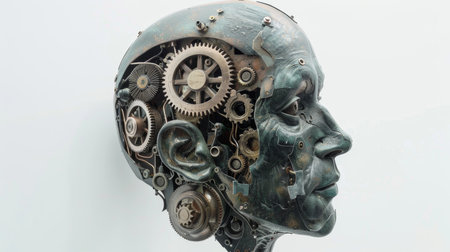 A human head with a toothed clockwork mechanism. The concept of thinking, decision-making.