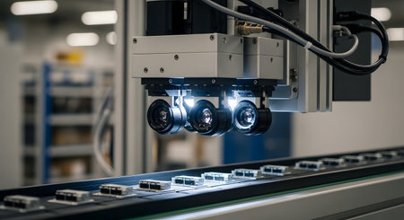 A close-up of a high-tech machine vision system with multiple cameras inspecting electronic components on a production line. This image represents industrial automation, quality control, and smart factory technology.