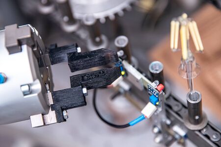 Smart factory LED electric glass lamp, modern automated production plant with robot arms. Concept future industry 4.0.