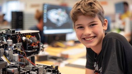 A smart boy in a robotics club constructs a robot while playing in a room.