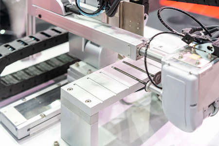 robotic arm catch for electronic assembly line. The robot for smart technology manufacturing process.