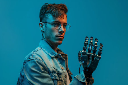 A close-up of a skilled engineer's hand controlling an advanced robotic hand in an industrial setting, showcasing the intersection of technology and innovation.