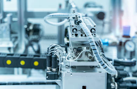 transducer on industrial machine robot in assembly line working in factory. Smart factory industry 4.0 concept.