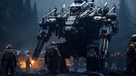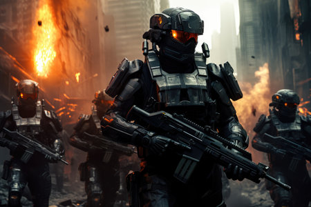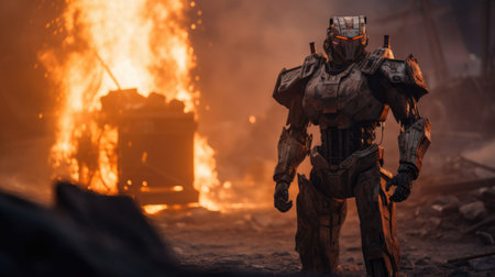 In a war-torn landscape, robotic soldiers march forward, illuminated by flames and explosions, demonstrating a powerful military strategy and advanced design.