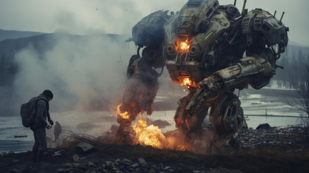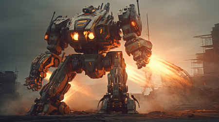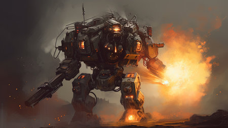 Steam-powered mech with a flamethrower. Fantasy concept, Illustration painting. Generative AI
