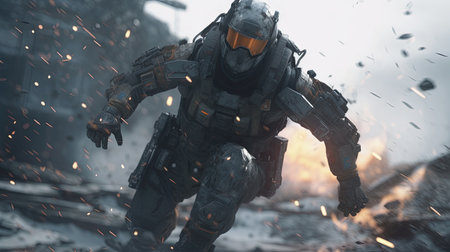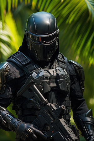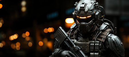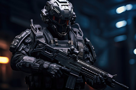 Warrior in body armor and with a machine gun. Man in an modern armor. Generative AI illustration