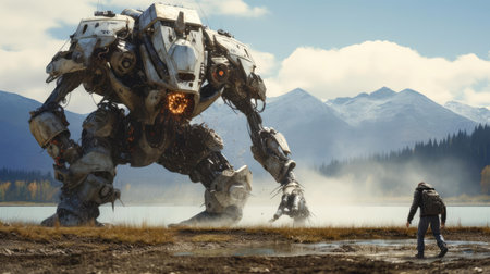 A futuristic robot stands prominently against a backdrop of dark clouds, highlighting its intricate features and design.