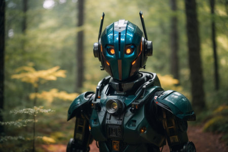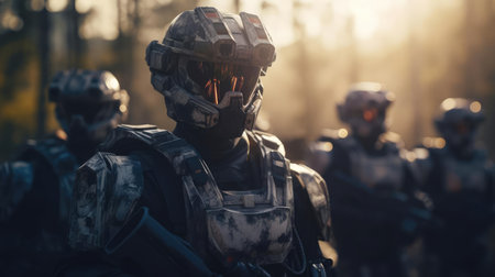 Soldier in the forest or jungle with advanced technology and AI helmet visor in metallic alloy armor as a bulletproof suit. Computer-aided target acquisition as an AIM bot.