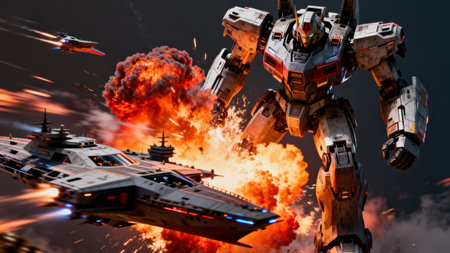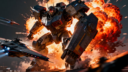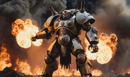 A large, armored robot fires flames from its hands, standing against a backdrop of fire and smoke