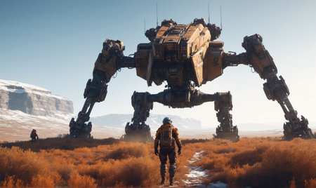 A lone astronaut walks toward a massive, towering mech in a desolate, snow-covered landscape