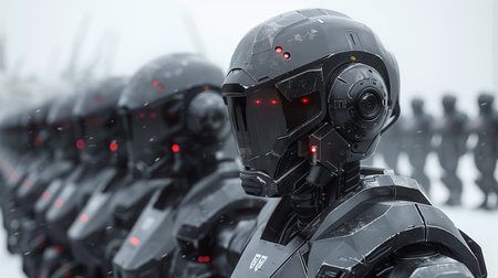 Futuristic Army of Robots Standing in Formation During Snowy Day in a Dystopian Landscape